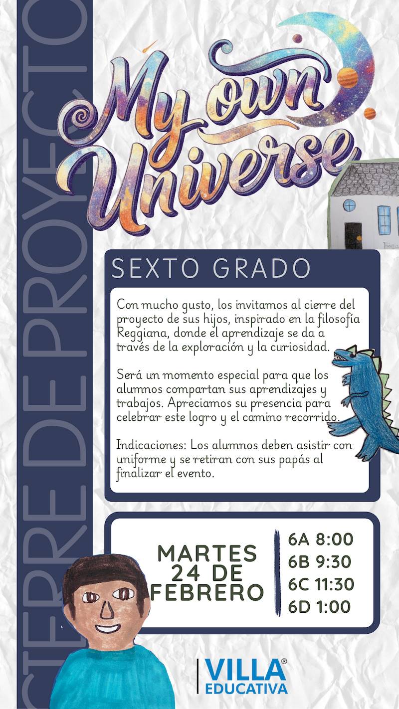 Lunes 23 de febrero: 1A (8:00) | 1B (9:30) | 1C (11:30) | 1D (1:00) - 6º Grado: «My Own Universe»