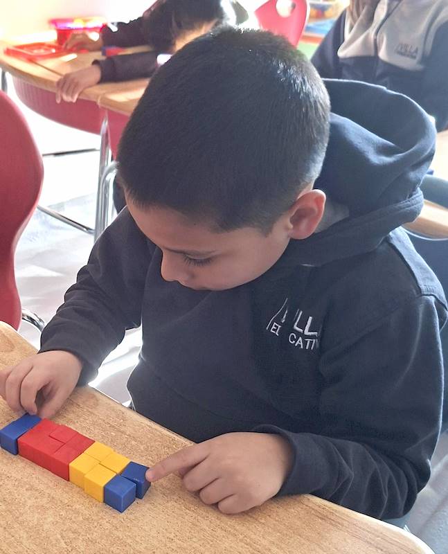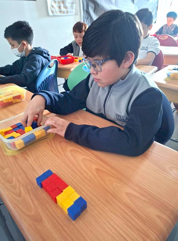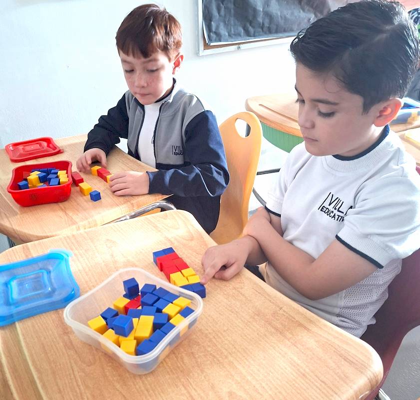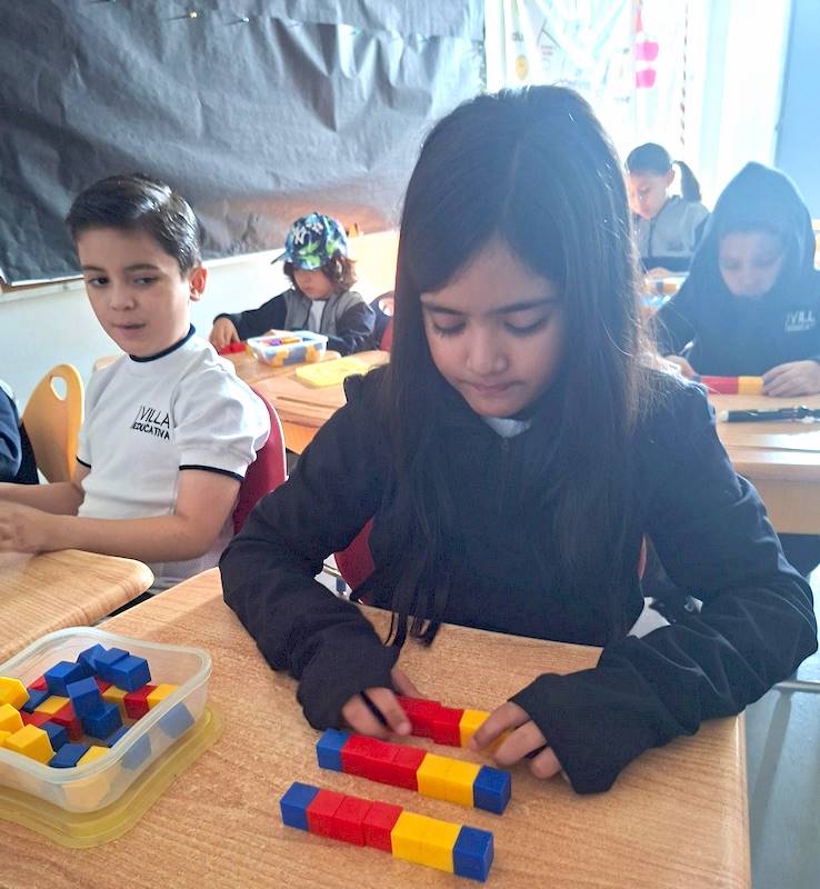 Durante la práctica de multiplicaciones utilizamos material concreto para que los alumnos de tercer grado aprendieran de forma activa y significativa. Con cubos representaron cantidades y comprendieron el valor posicional (unidades, decenas, centenas y unidades de millar), así como la descomposición de números.