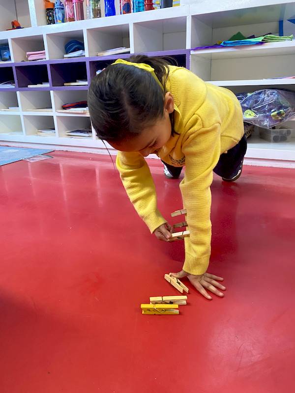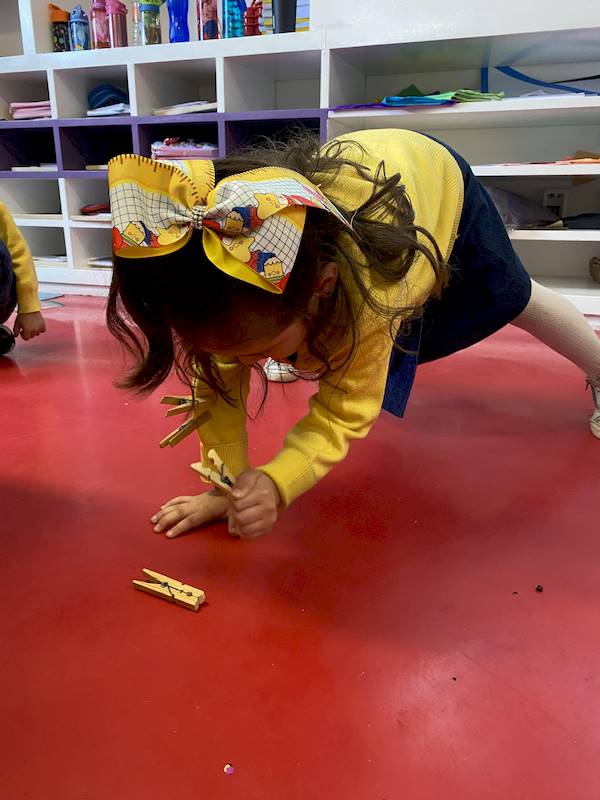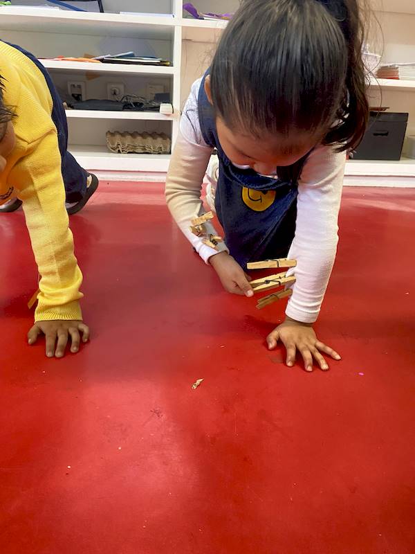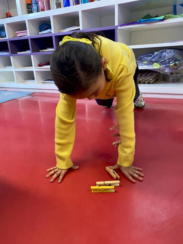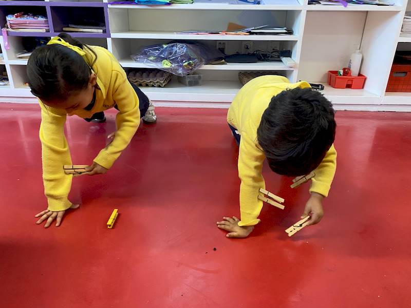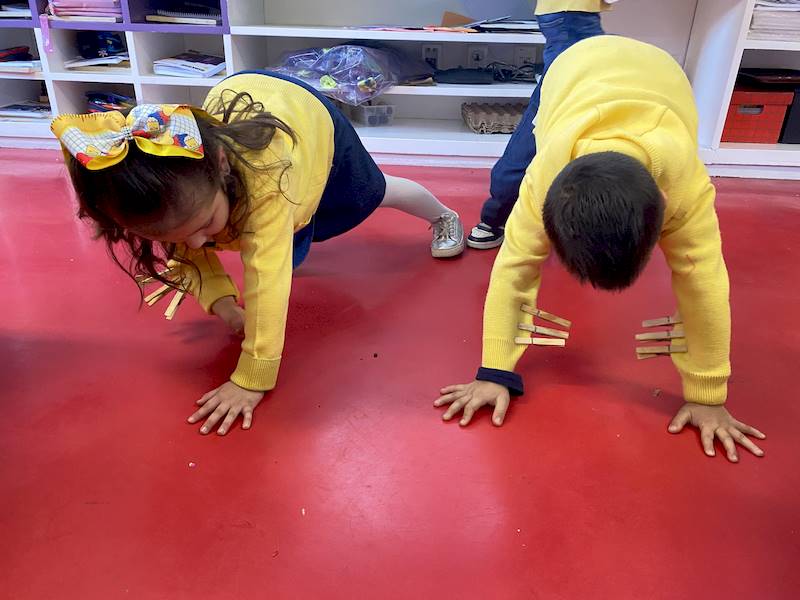 Mientras mantenían una posición de plancha alta, debían retirar cuidadosamente cada pinza una por una. Nuestros alumnos practicaron sus habilidades de conteo: primero identificando las pinzas de cada lado y, finalmente, calculando el número total de pinzas recolectadas.