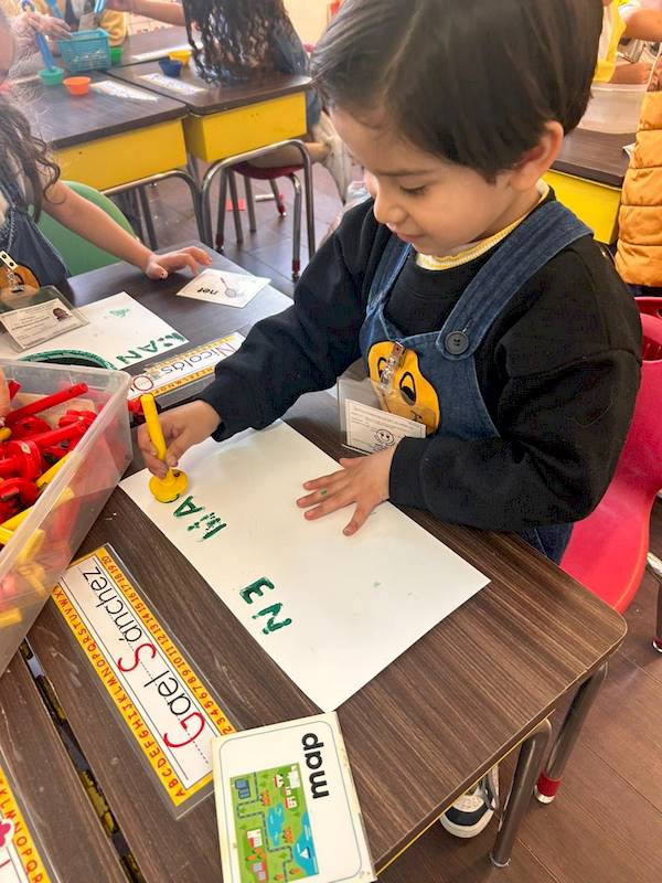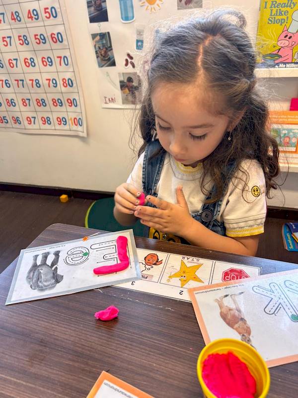 In the second station, students molded Play-Doh to form letters while practicing vocabulary. This hands-on literacy experience allowed kids to connect letter formation with word recognition, supporting both tactile learning and language development.
