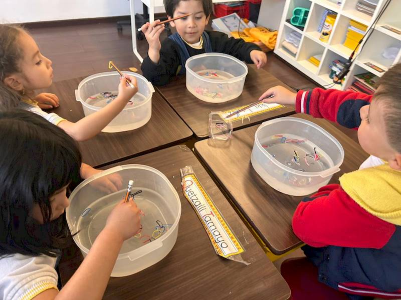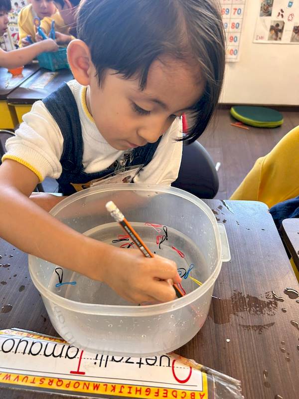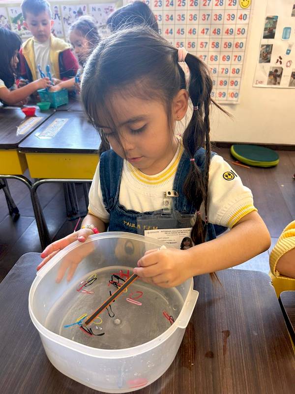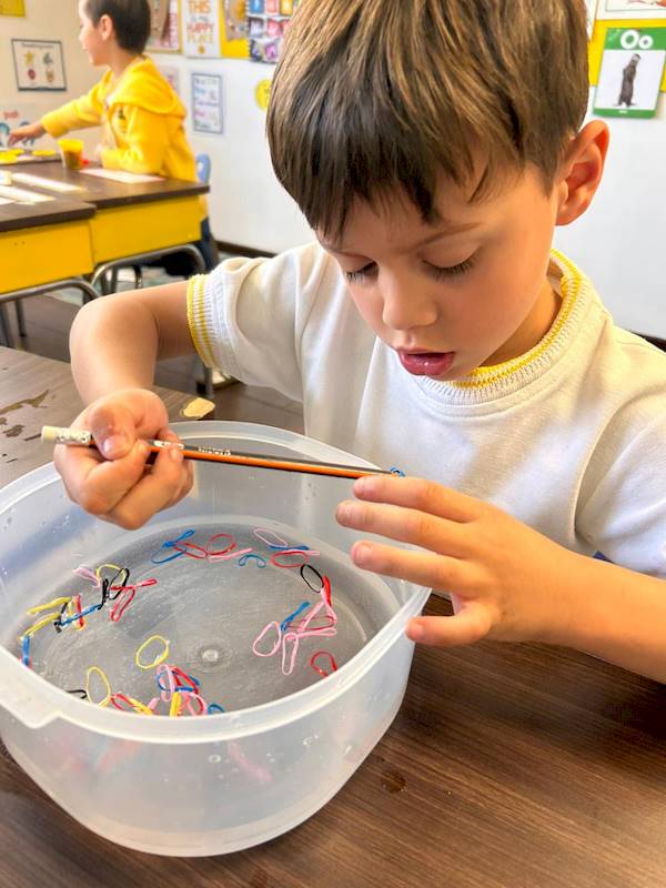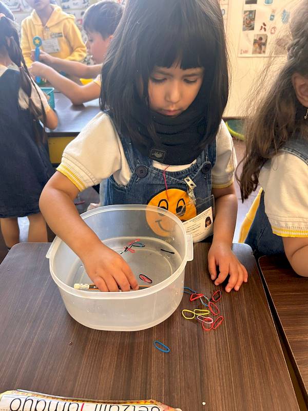 En la tercera estación, nuestros niños usaron un lápiz para sacar gomas elásticas, una actividad diseñada para mejorar la fuerza de agarre del lápiz y el control motor fino. Esto los preparó para las primeras habilidades de escritura, manteniéndolos activos y motivados.