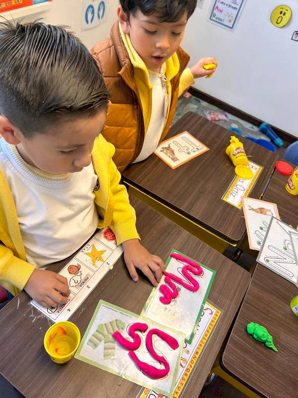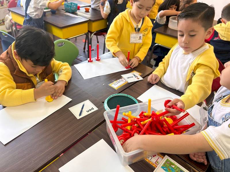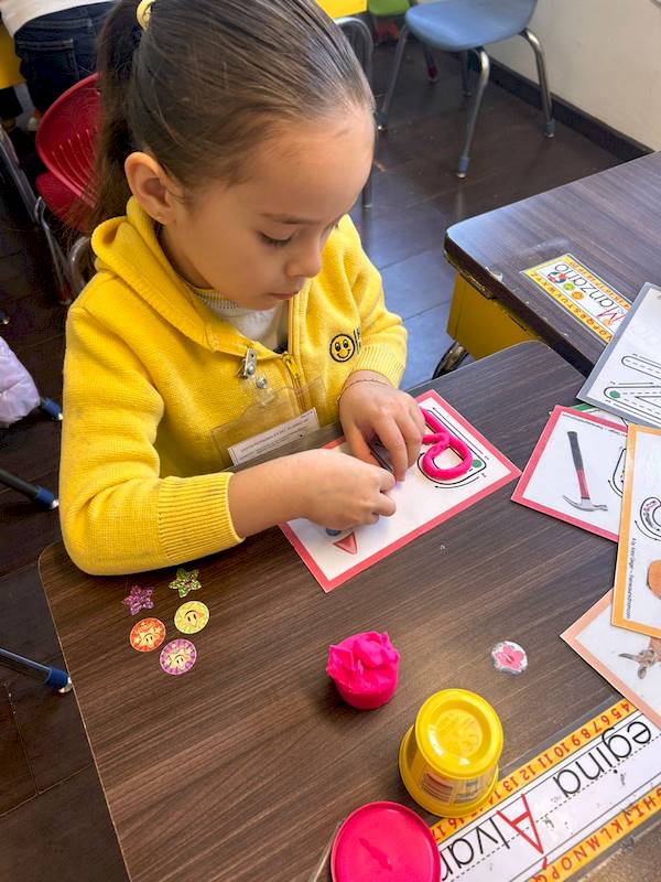 En la segunda estación, los niños moldearon plastilina para formar letras mientras practicaban vocabulario. Esta experiencia práctica de lectoescritura permitió a los niños conectar la formación de letras con el reconocimiento de palabras, lo que fomenta tanto el aprendizaje táctil como el desarrollo del lenguaje.