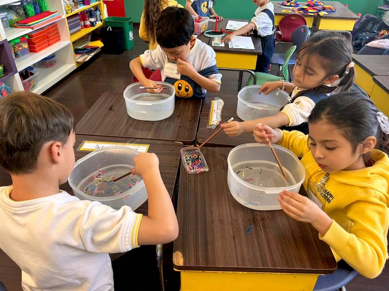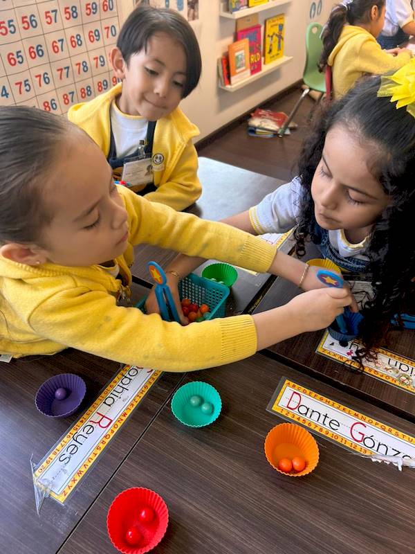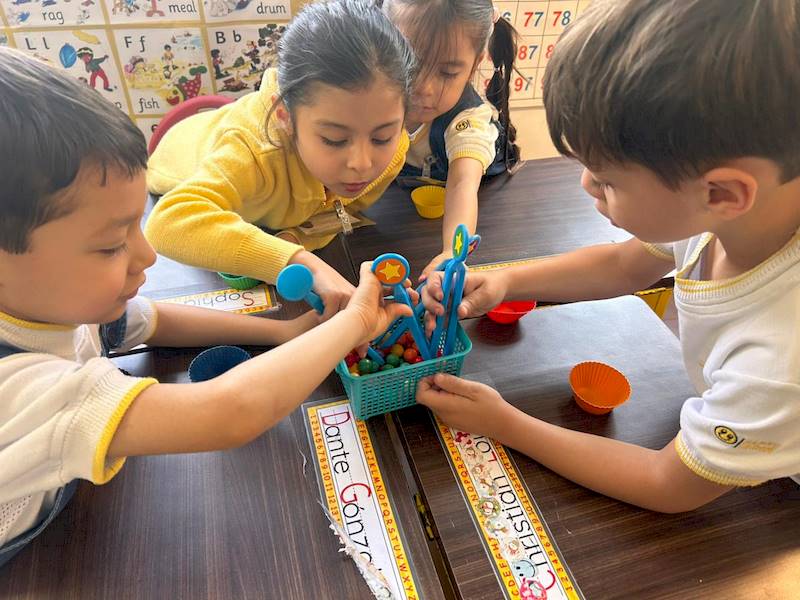 La primera estación se centró en la clasificación de colores con pinzas para la motricidad fina. Los niños clasificaron objetos por color mientras fortalecían su motricidad fina y la coordinación ojo-mano. Esta actividad también reforzó conceptos matemáticos tempranos como la categorización y la discriminación visual.
