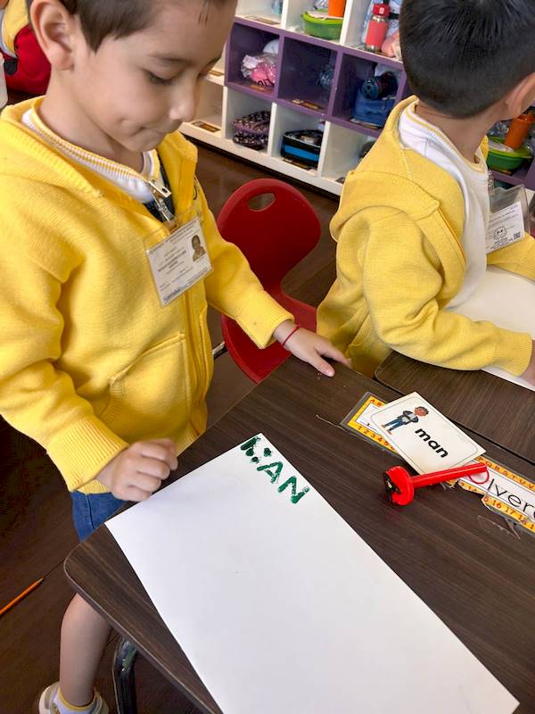 Finally, in the fourth station, kiddos used stamps to form words, and then practiced reading them aloud. This station reinforced phonemic awareness, word recognition, and confidence in early reading.