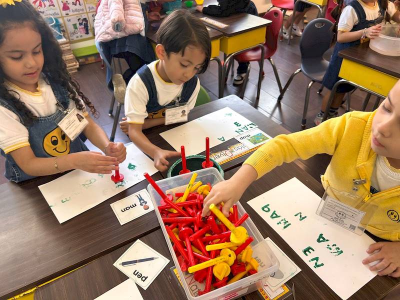 Finalmente, en la cuarta estación, los niños usaron sellos para construir y formar palabras, y luego practicaron la lectura en voz alta. Esta estación reforzó la conciencia fonológica, el reconocimiento de palabras y la confianza en la lectura temprana.