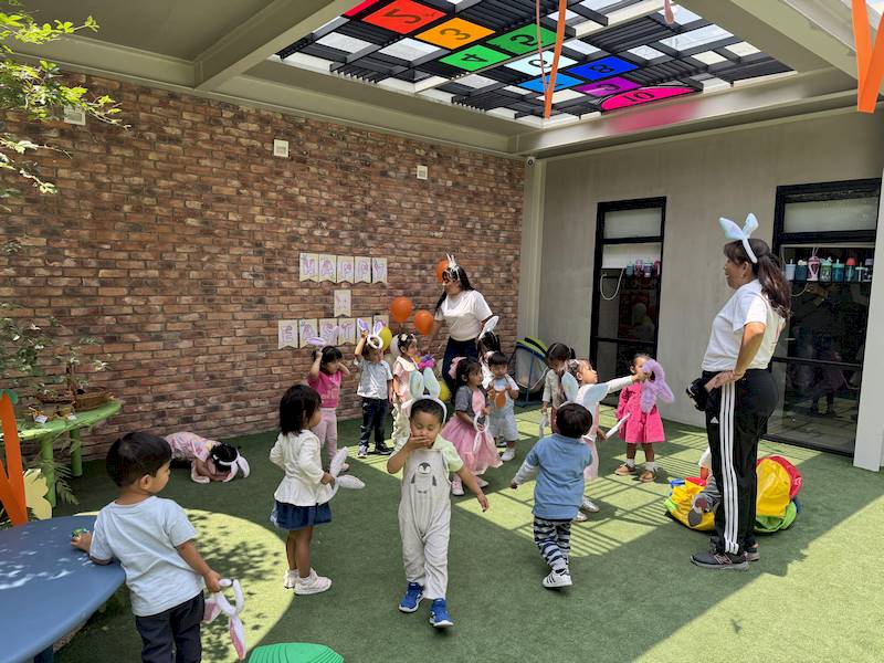 También realizaron juego simbólico cosechando zanahorias, un circuito de motricidad gruesa y una búsqueda de huevos de Pascua. ¡Además, recibimos la visita de Mr. Happy con sus orejas de conejo!
